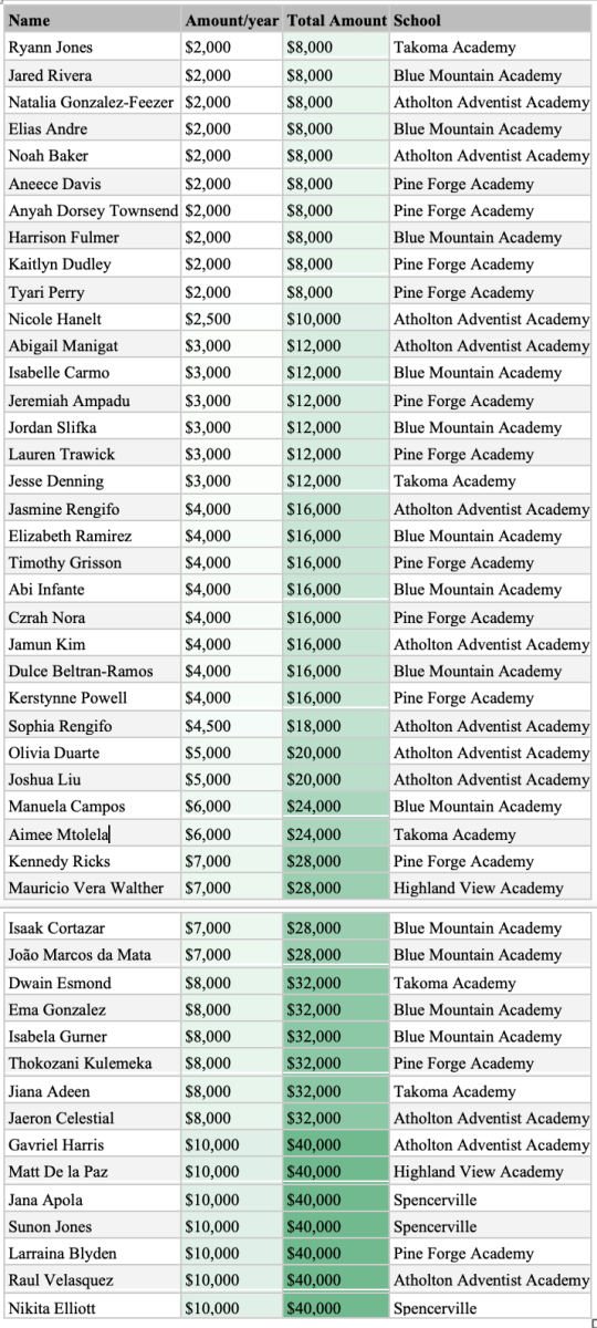 Brian Liu, MusicFest director and assistant professor of Music at the university, reports that they awarded 47 scholarships, totaling $980,000 to the following Columbia Union students (below).